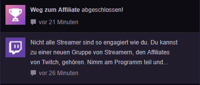 Voller Freude schaute ich mir die Meldung an und dann stand da noch "Nicht alle Streamer sind do engagiert wie du. Du kannst zu einer neuen Gruppe von Streamern, den Affiliates von Twitch, gehören." Ich klickte die Meldung an und begann mit der Anmeldung. Nach gefühlten zwei Stunden Formularen ausfüllen uns bestätigen das ich keinen Wohnsitz, Firma oder Konten in den USA habe war es dann soweit und mein Subscribe und Bits Button war da ![]()