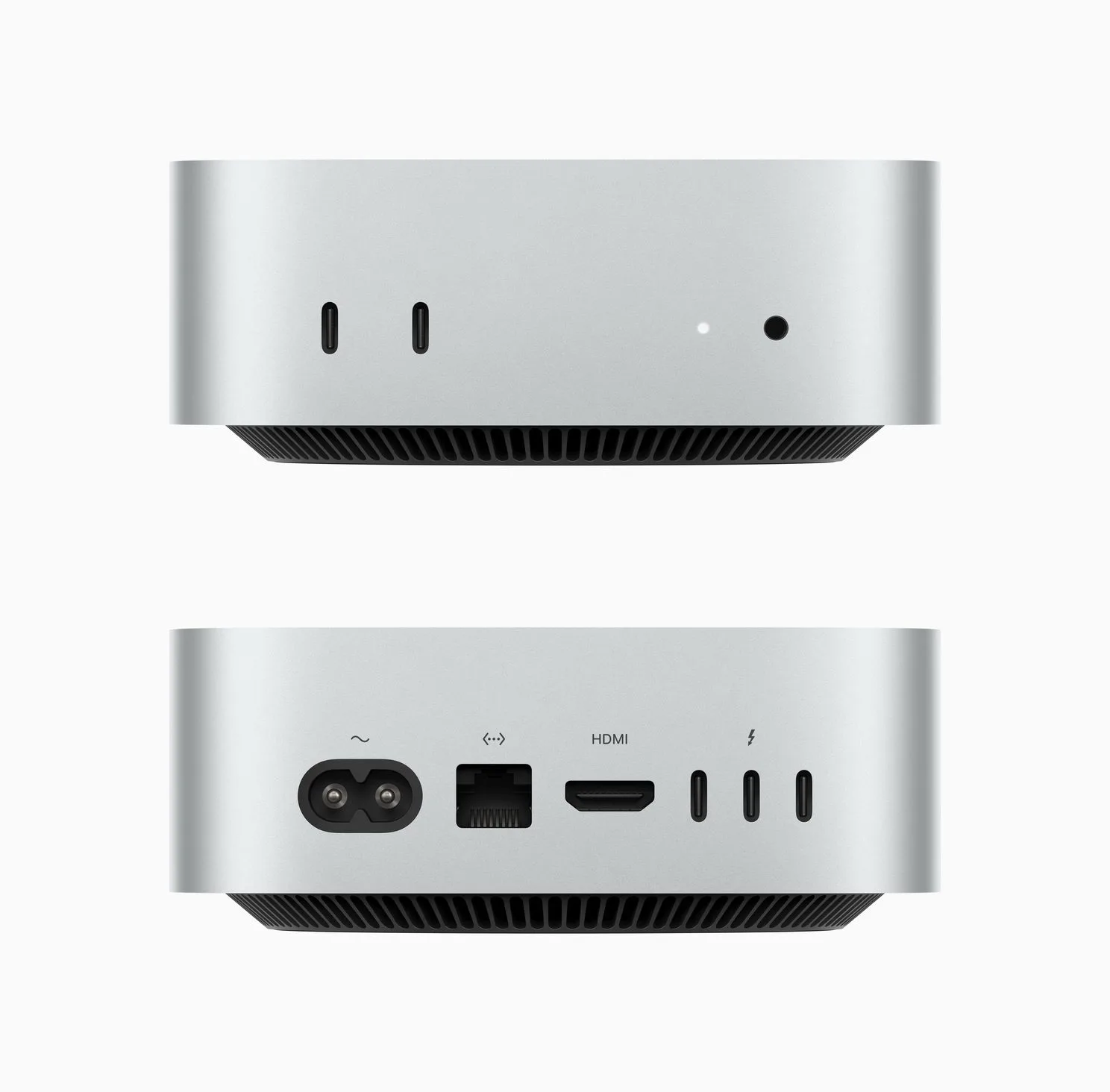 Eine besondere Neuerung beim Mac Mini M4 ist die vielseitige Anschlusssituation. Inspiriert vom Mac Studio, finden sich nun Anschlüsse sowohl an der Vorder- als auch an der Rückseite des Gehäuses, was den Zugang zu Peripheriegeräten wesentlich erleichtert. Der M4 Pro bringt zusätzlich den neuen Thunderbolt 5-Standard, der Übertragungsgeschwindigkeiten von bis zu 120 Gbit/s ermöglicht und damit eine zukunftssichere Verbindung bietet.