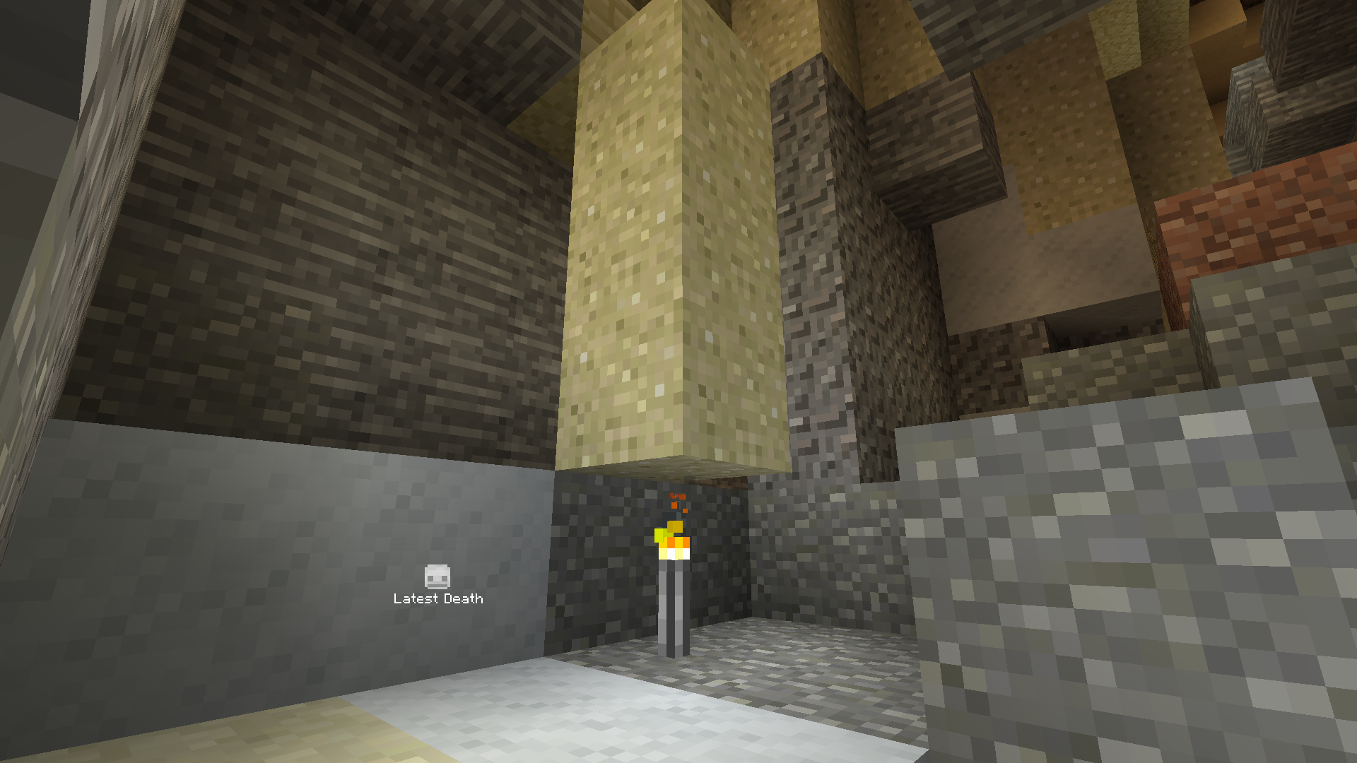 Also so etwas ist mir noch nie passiert. Eigentlich wollte ich eine Fackel unter den fallenden Sand setzen um diesen schneller ab zu bauen aber anscheinend habe ich die Fackel so schnell gesetzt, dass der Sand darüber noch nicht einmal angefangen hat zu fallen und so auf der Fackel liegen geblieben ist.