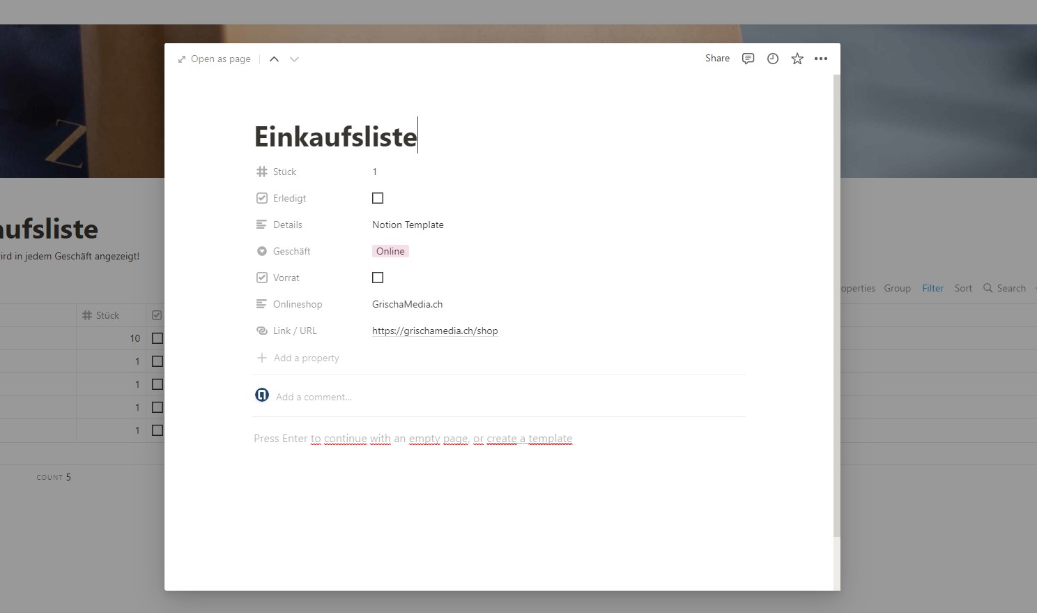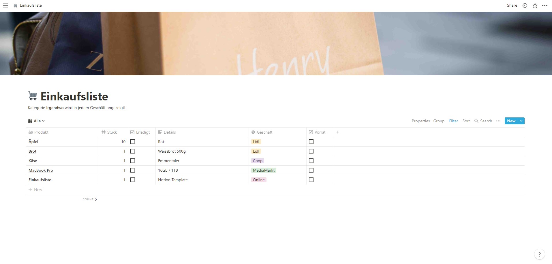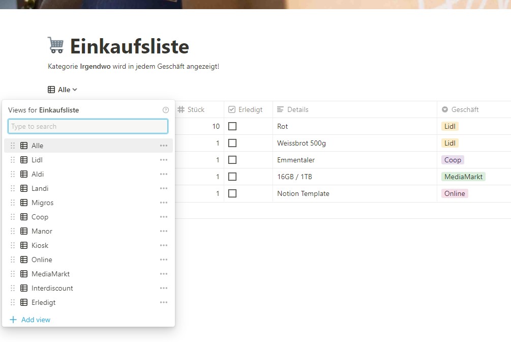 Mit dem Notion Template "Einkaufsliste" ist es ganz einfach Ihren Einkauf alleine oder mit Freunden und der Familie zu Organisieren.